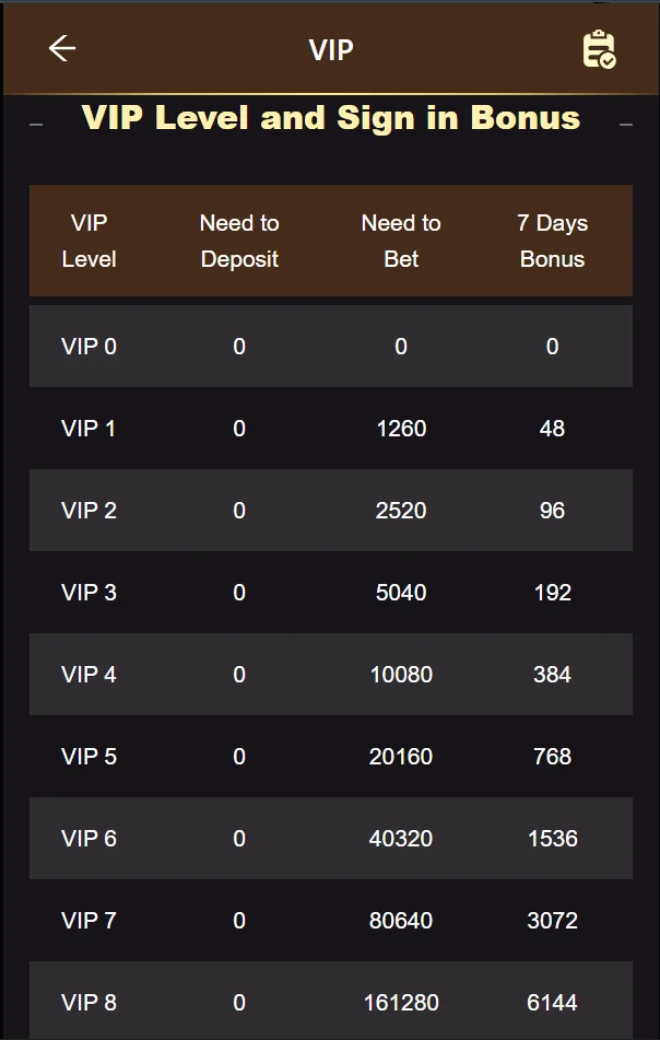| VIP Level | Need to Deposit | Need to Bet | Level Up Bonus |