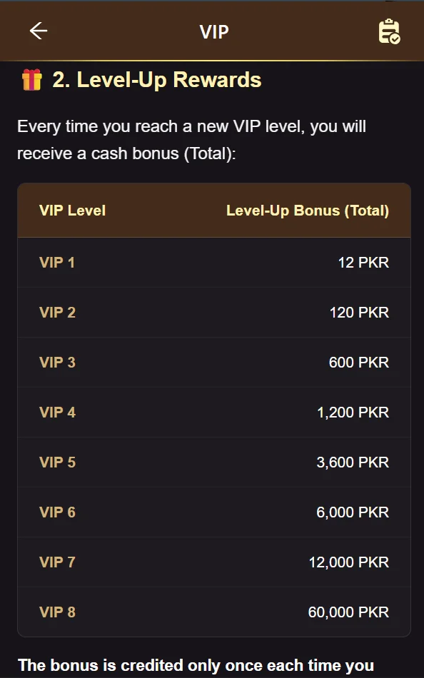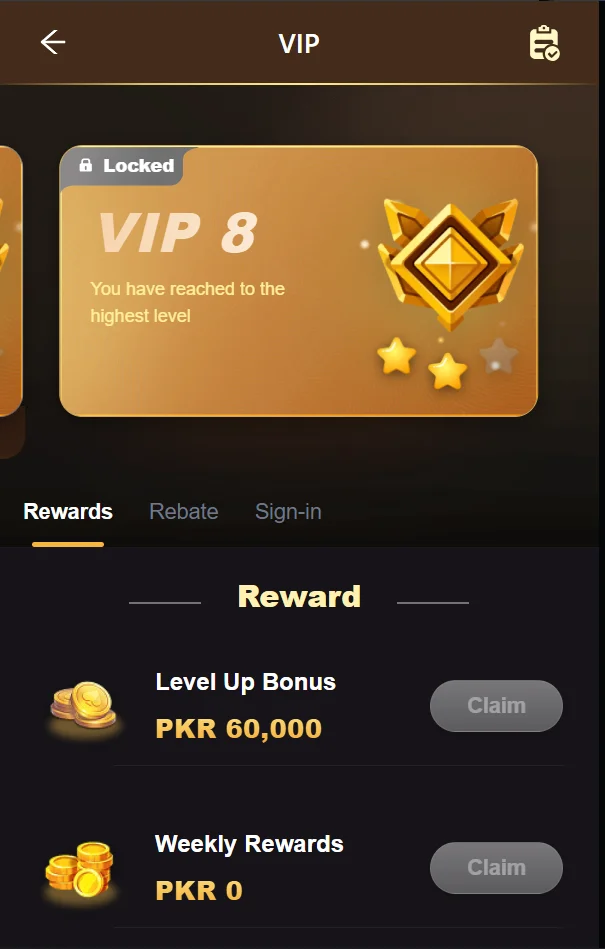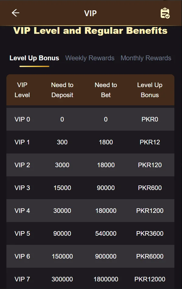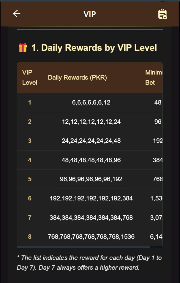 | VIP Level | Daily Rewards (PKR) | Minimum Bet |