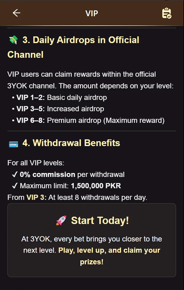 Finally, the 3YOK Game provides strong withdrawal benefits for all VIP users. There is 0% commission on every withdrawal, which means users keep all their earnings. Also, the maximum limit is 1,500,000 PKR, which is quite high. From VIP 3, users can make at least 8 withdrawals per day. Because of these features, users feel secure and confident while managing their money.